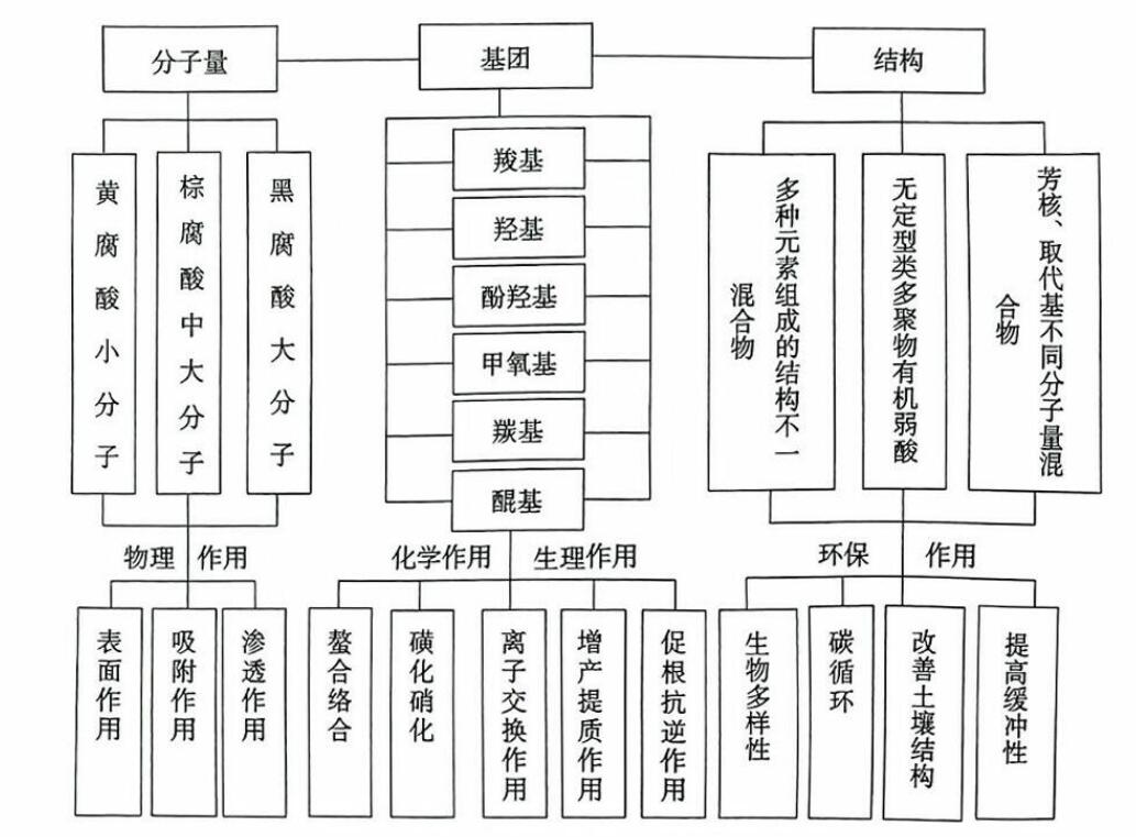 腐植酸中的官能團(主要是羧基和酚羥基)能釋放出活潑氫離子,使腐植酸表現(xiàn)出弱酸性和化學反應(yīng)性,具有較強的離子交換能力、吸附、絡(luò)(螯)合作用。在分散體系中可作為聚電解質(zhì)、有凝聚、膠溶、分散等作用。腐植酸分子上還有一定數(shù)量的自由基(醌基、羧基和酚羥基等),使其具有生理活性。